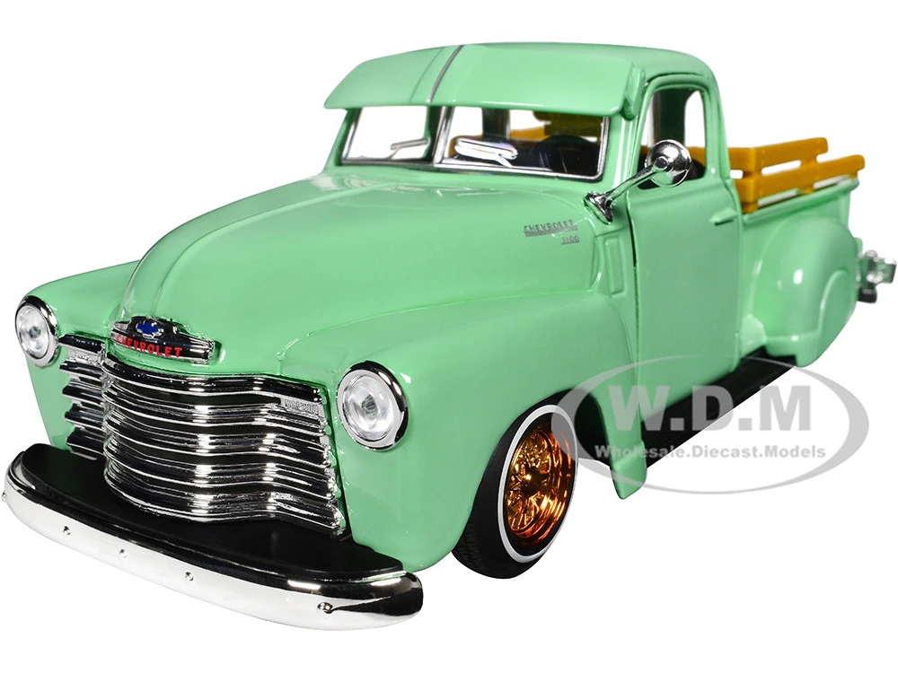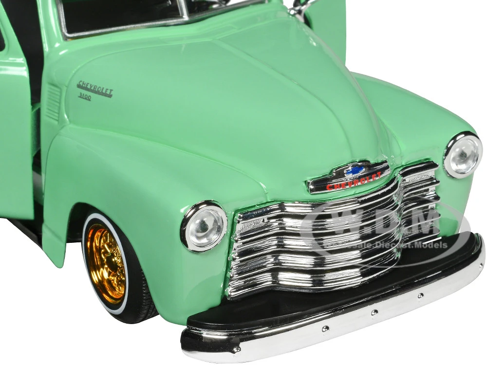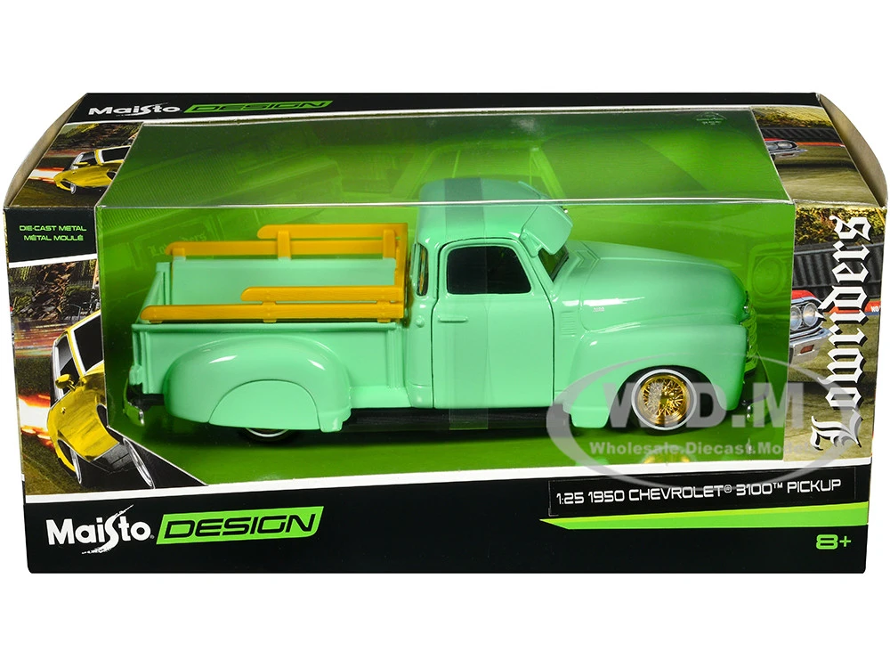 - Brand new 1/24 scale diecast car model of 1950 Chevrolet 3100 Pickup Truck Lowrider Light Green with Gold Wheels “Lowriders” Series die cast model car by Maisto.