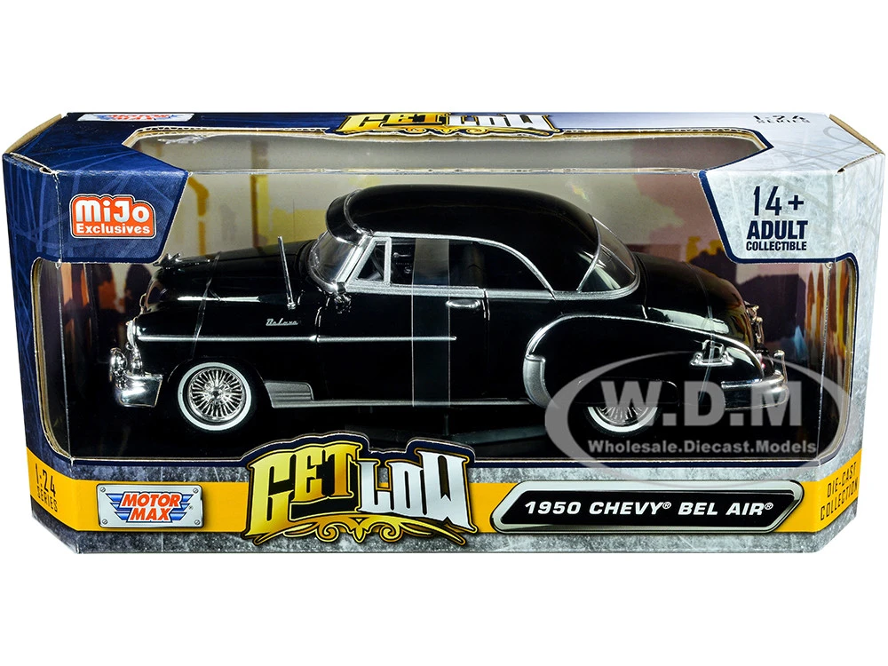- Brand new 1/24 scale diecast car model of 1950 Chevrolet Bel Air Lowrider Black “Get Low” Series die cast model car by Motormax.