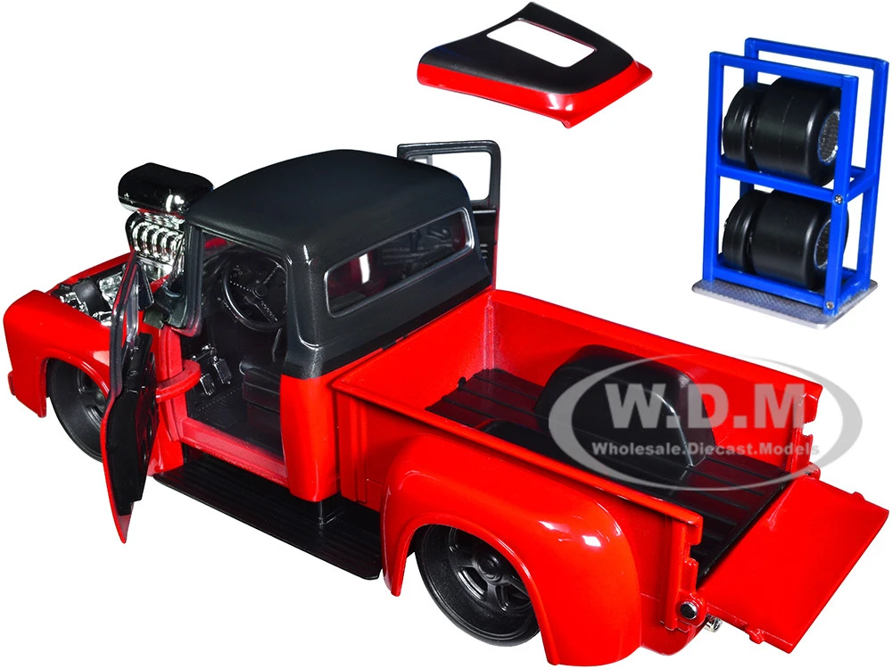 - Brand new 1/24 scale diecast car model of 1956 Ford F-100 Pickup Truck Red and Dark Gray Metallic with Extra Wheels “Just Trucks” Series die cast model car by Jada.