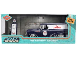 - Brand new 1/24 scale diecast car model of 1957 Chevrolet Suburban “Chevron” Dark Blue with White Stripes and Chevron Gas Pump “Just Trucks” Series die cast model car by Jada.