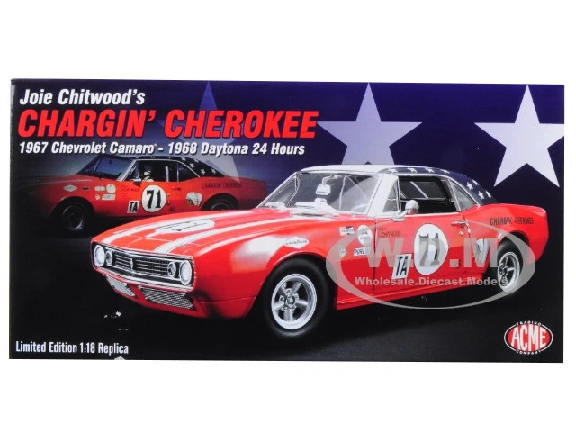 - Brand new 1:18 scale diecast car model of 1967 Chevrolet Camaro #71 Joie Chitwood “Chargin’ Cherokee” Daytona 24 Hours 1968 Limited Edition to 390 pieces Worldwide die cast model car by Acme.