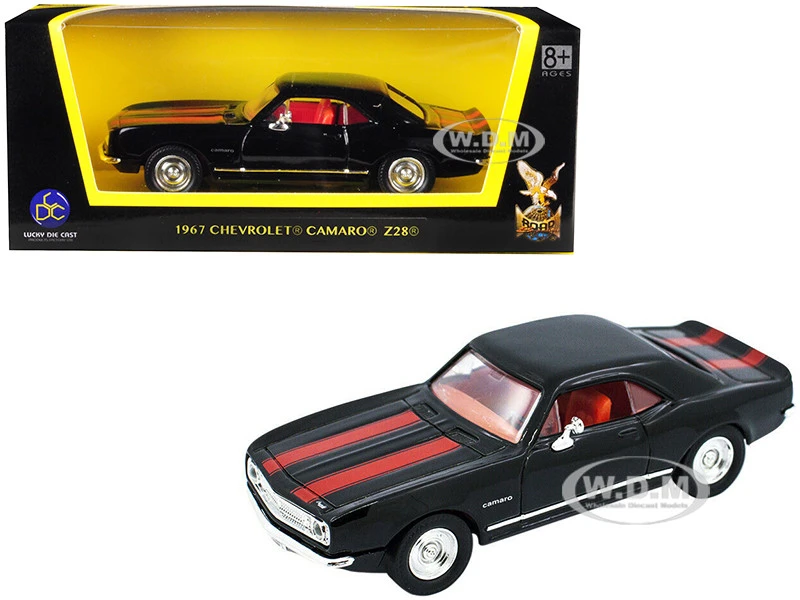 - Brand new 1/43 scale diecast car model of 1967 Chevrolet Camaro Z-28 Black with Red Stripes die cast model car by Road Signature.