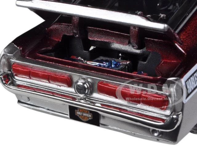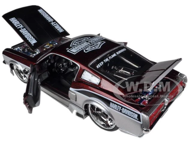 - Brand new 1/24 scale diecast car model of 1967 Ford Mustang GT Red and Silver “Harley Davidson” die cast model car by Maisto.
