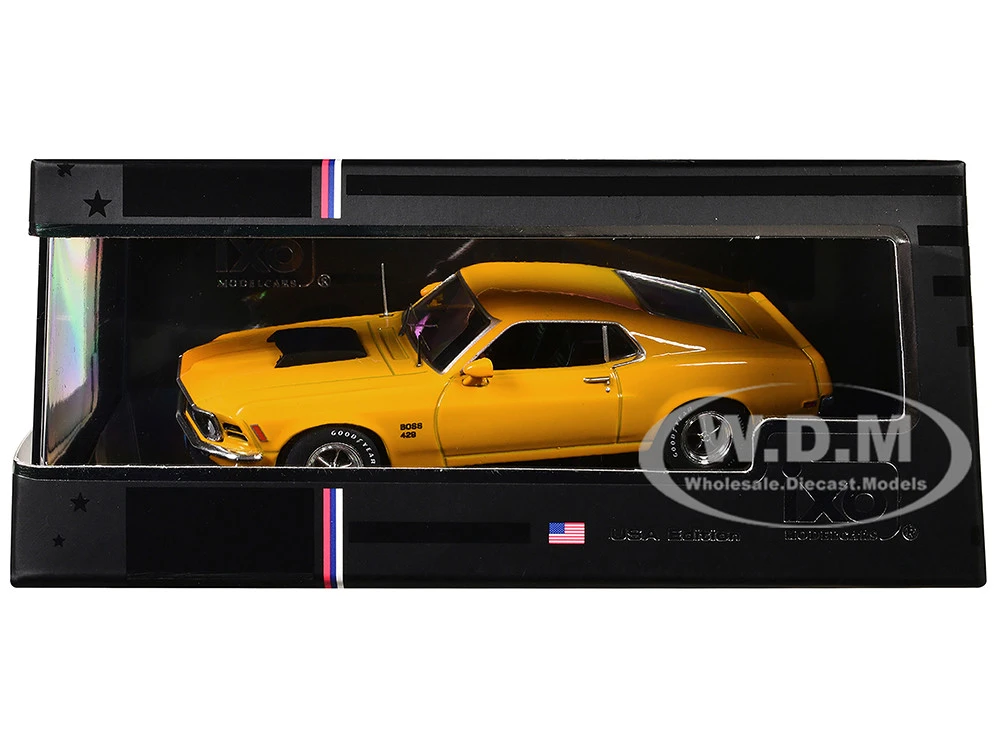 - Brand new 1/43 scale diecast model of 1970 Ford Mustang Boss 429 Bright Yellow with Black Hood Scoop die cast model by IXO Models.