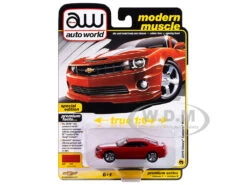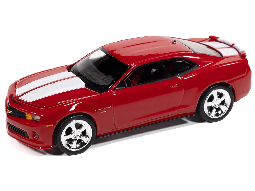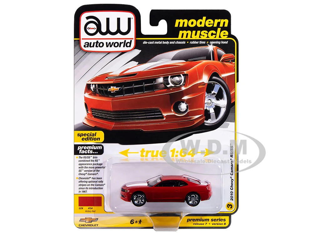 - Brand new 1/64 scale diecast car model of 2010 Chevrolet Camaro RS/SS Victory Red with White Stripes “Modern Muscle” Series die cast model car by Auto World.
