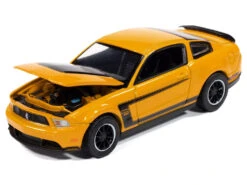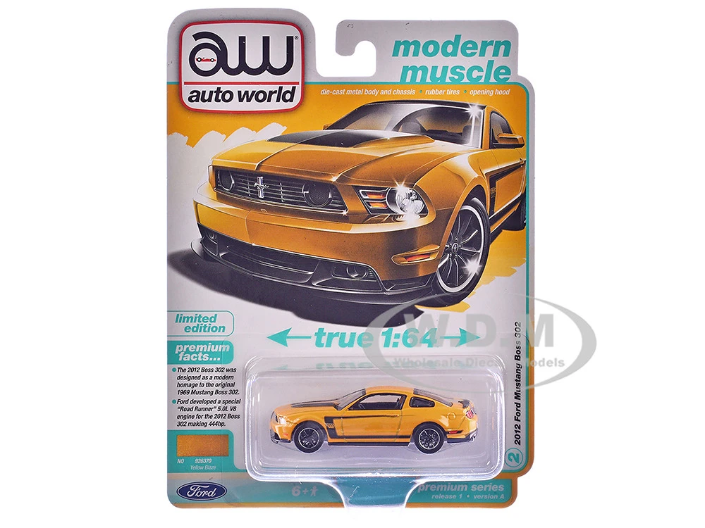 - Brand new 1/64 scale diecast car model of 2012 Ford Mustang Boss 302 Yellow Blaze with Black Accents “Modern Muscle” Series die cast model car by Auto World.