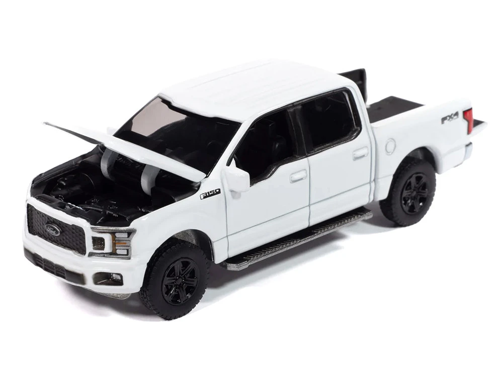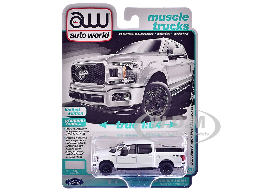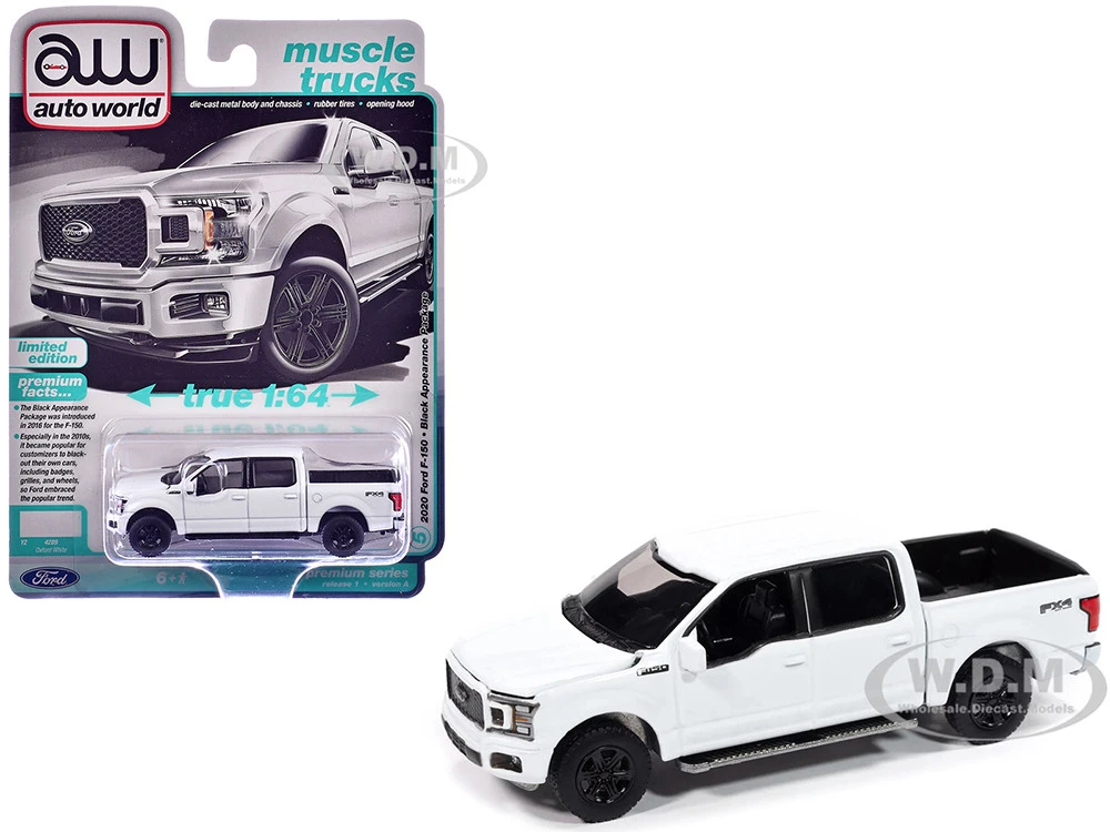 - Brand new 1/64 scale diecast car model of 2020 Ford F-150 FX4 Black Appearance Package Pickup Truck Oxford White “Muscle Trucks” Series die cast model car by Auto World.