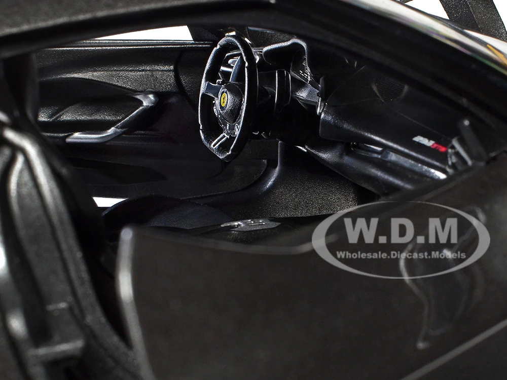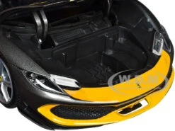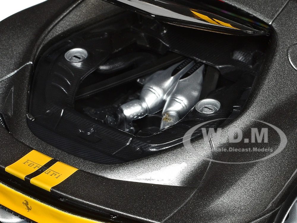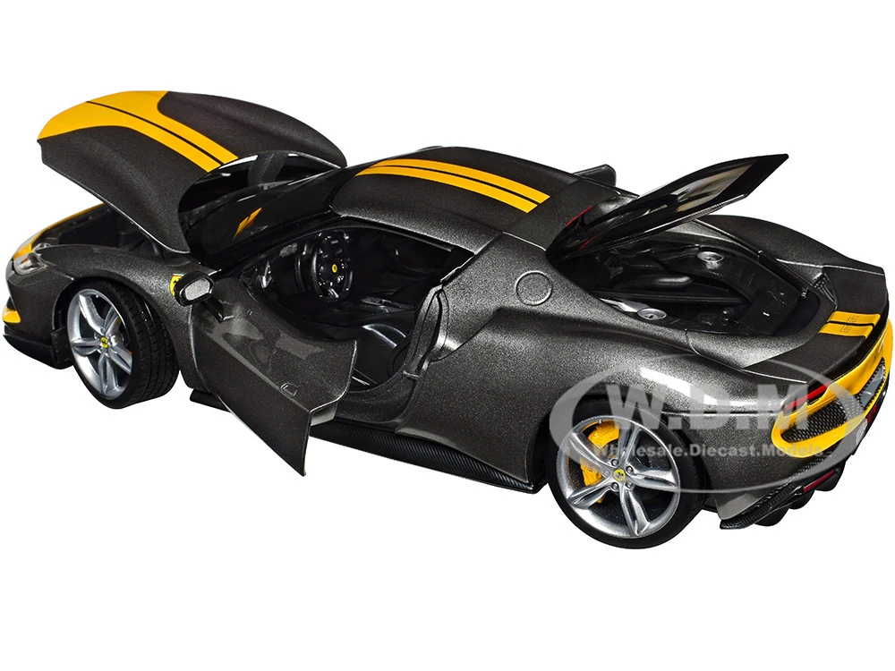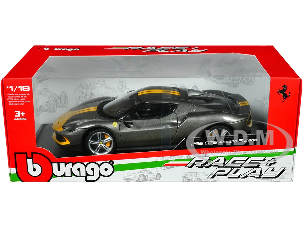 - Brand new 1/18 scale diecast car model of Ferrari 296 GTB Assetto Fiorano Gray Metallic with Yellow Stripes “Race + Play” Series die cast model car by Bburago.