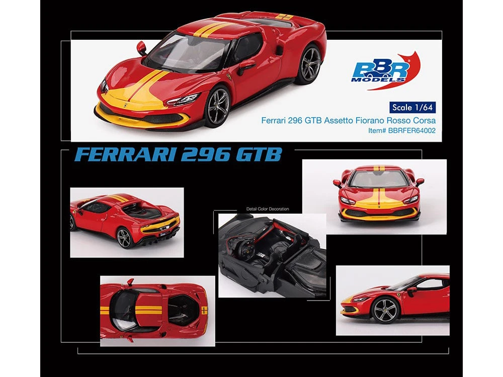 - Brand new 1/64 scale diecast car model of Ferrari 296 GTB Assetto Fiorano Rosso Corsa Red with Yellow Stripes die cast model car by BBR Models.