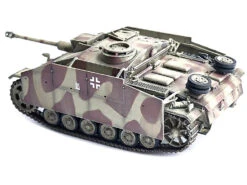 The StuG III Ausf. G, produced in May 1943, with Schürzen (armor skirts), was a crucial asset to German armored forces during the Battle of Kursk, one of the largest tank battles in history. The StuG III, originally designed as an infantry support vehicle, had by this point in the war been upgraded with improved anti-tank capabilities. Its low profile, thick frontal armor, and the 7.5 cm StuK 40 L/48 gun made it a formidable opponent, especially against Soviet T-34s. The Schürzen side skirts, added in 1943, provided additional protection against Soviet anti-tank rifles and shaped-charge weapons, further enhancing the StuG III’s battlefield survivability.