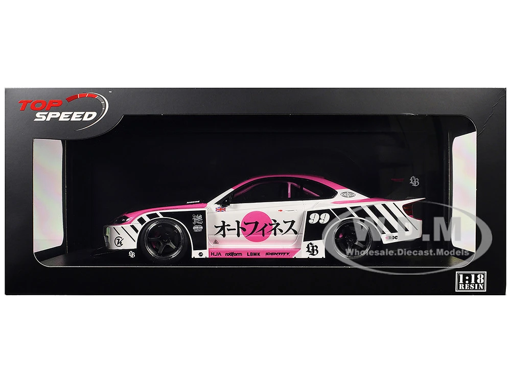 - Brand new 1/18 scale car model of Nissan “LB-Super Silhouette” S15 SILVIA RHD (Right Hand Drive) #99 “Auto Finesse – SEMA 2023” White and Pink model car by Top Speed.