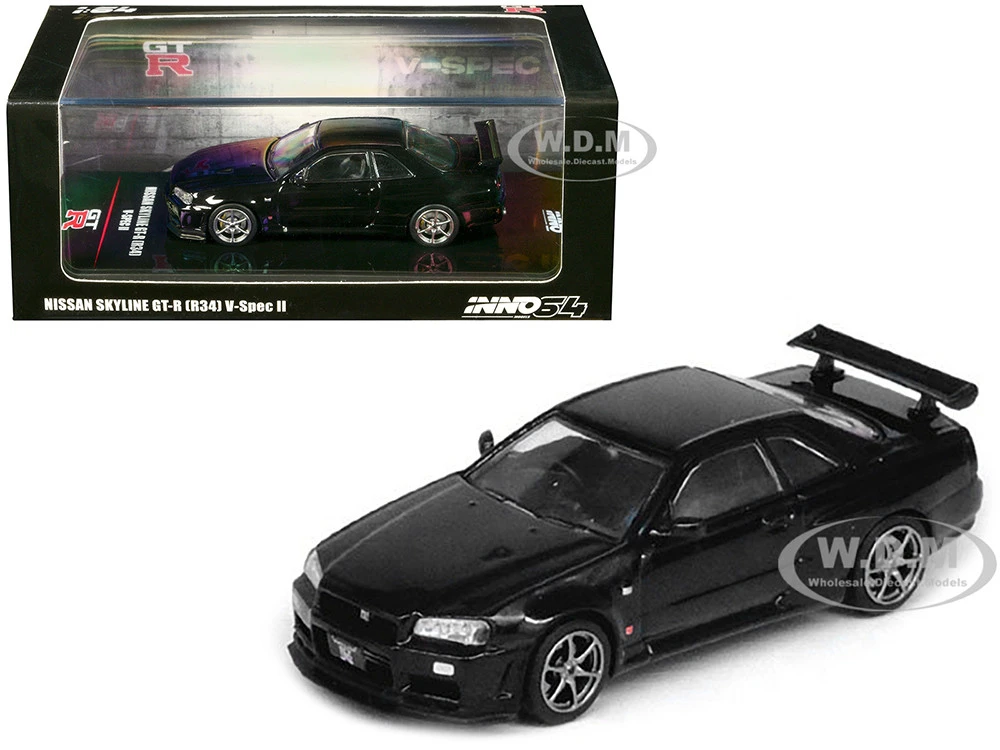 - Brand new 1/64 scale diecast car model of Nissan Skyline GT-R (R34) V-SPEC II RHD (Right Hand Drive) Black die cast model car by Inno Models.