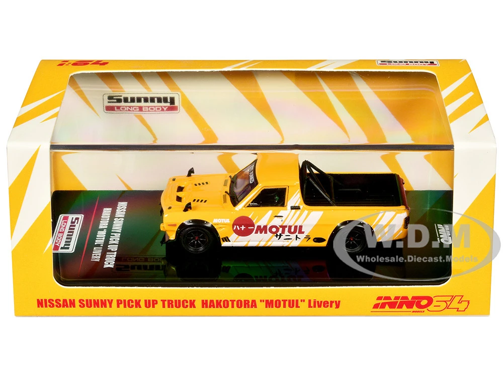 - Brand new 1/64 scale diecast car model of Nissan Sunny “Hakotora” Pickup Truck RHD (Right Hand Drive) “Motul” Yellow with White Stripes die cast model car by Inno Models.