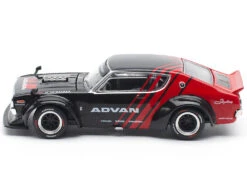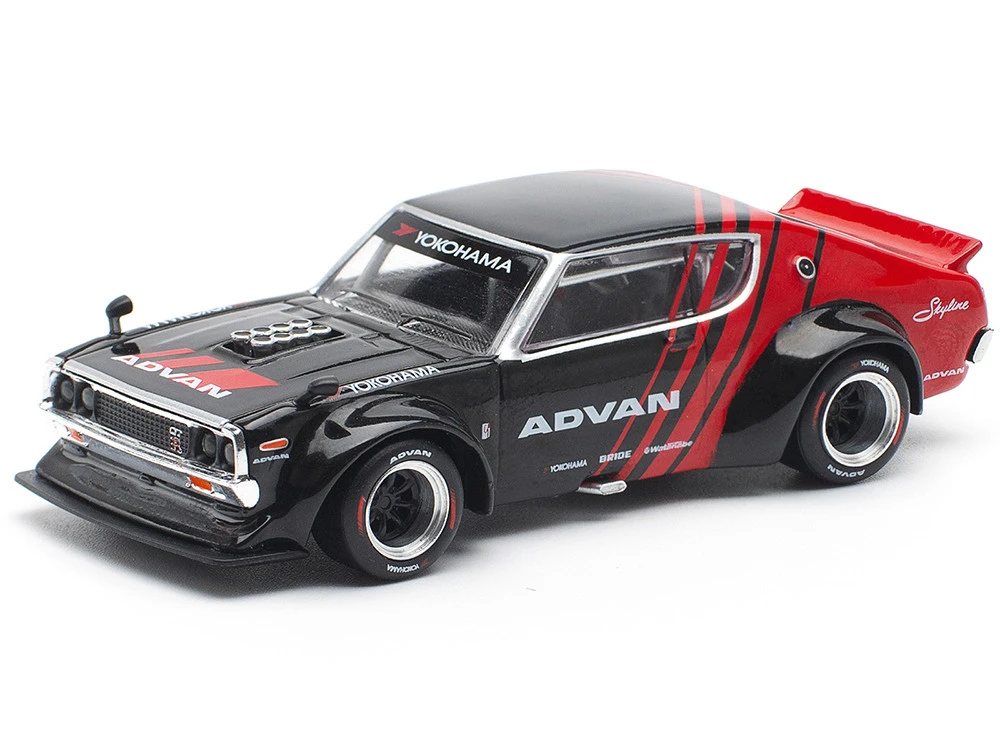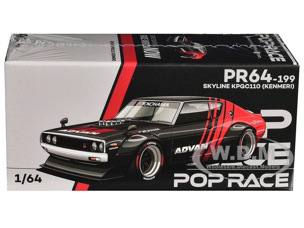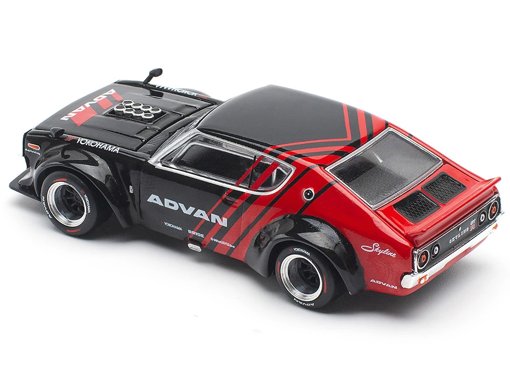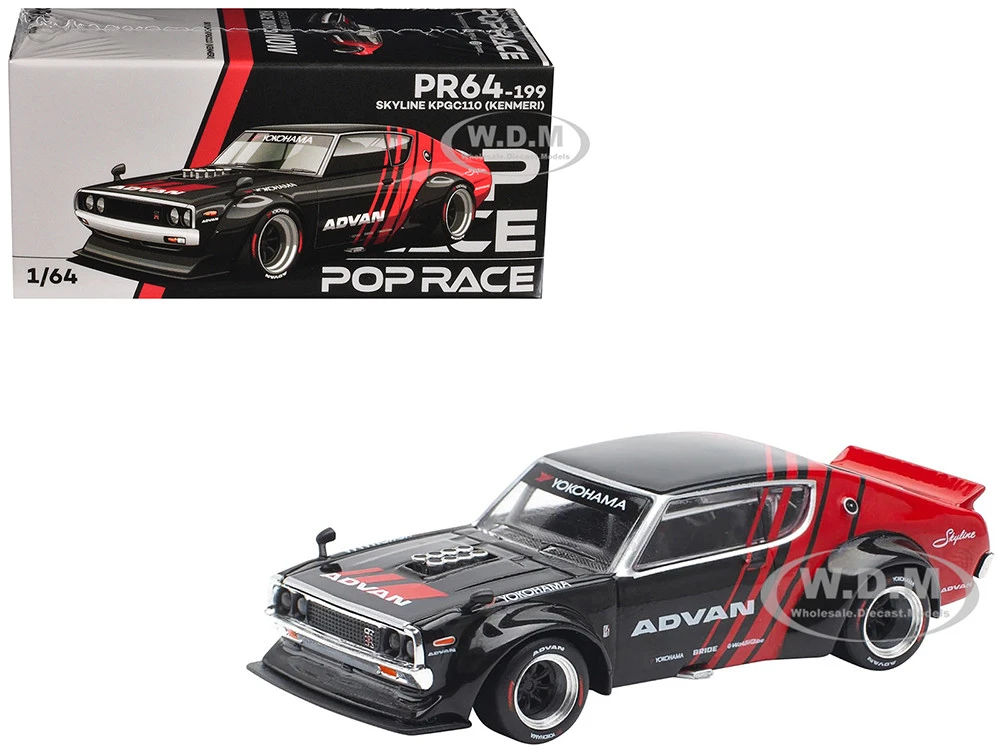 - Brand new 1/64 scale diecast car model of Skyline KPGC110 “Kenmeri” RHD (Right Hand Drive) “ADVAN” Black and Red die cast model car by Pop Race.